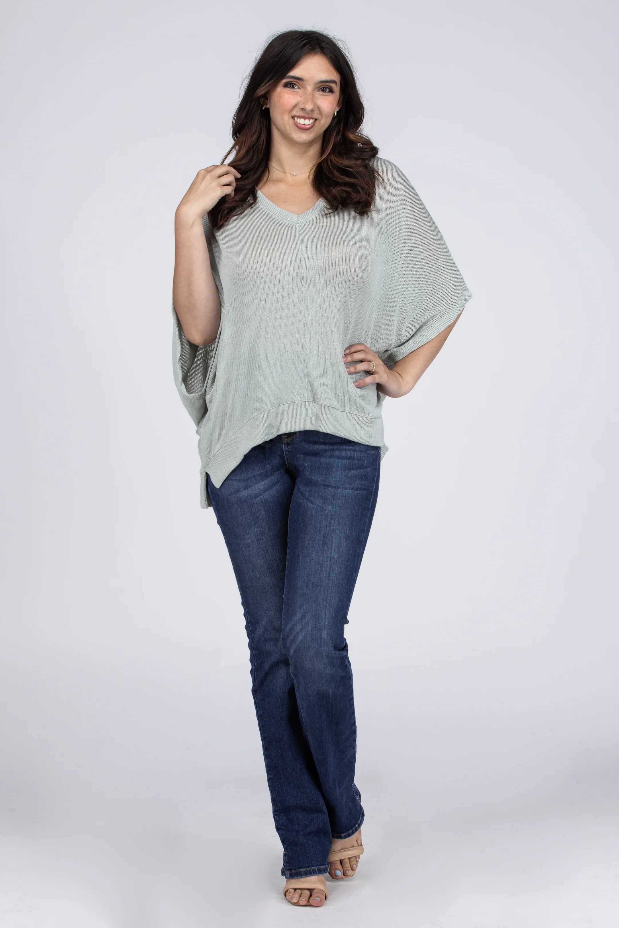The Talk To Me Top by She & Sky is a light-weight sheer knit with batwing sleeves , a V-neckline, and slight high-low hem with flattering side-slits! Don't keep your thoughts to yourself - let your shirt do the talking for you!