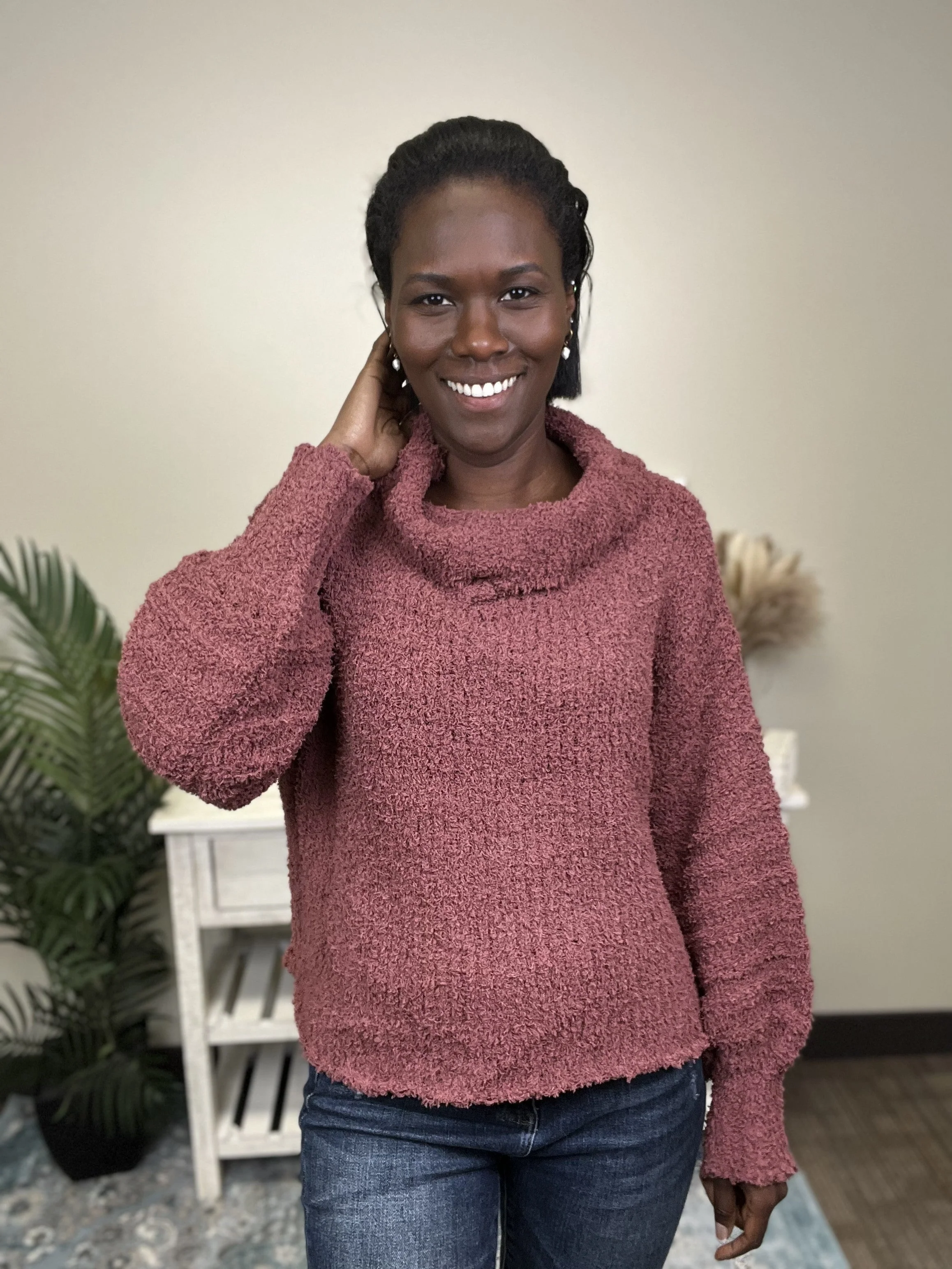 The Too Cozy For You Sweater by Easel is the perfect sweater to stay cozy in! This sweater features a turtle neck, inverted back seam, bubble sleeves and teddy bear type material. The Too Cozy For You Sweater can be paired with your favorite denim!