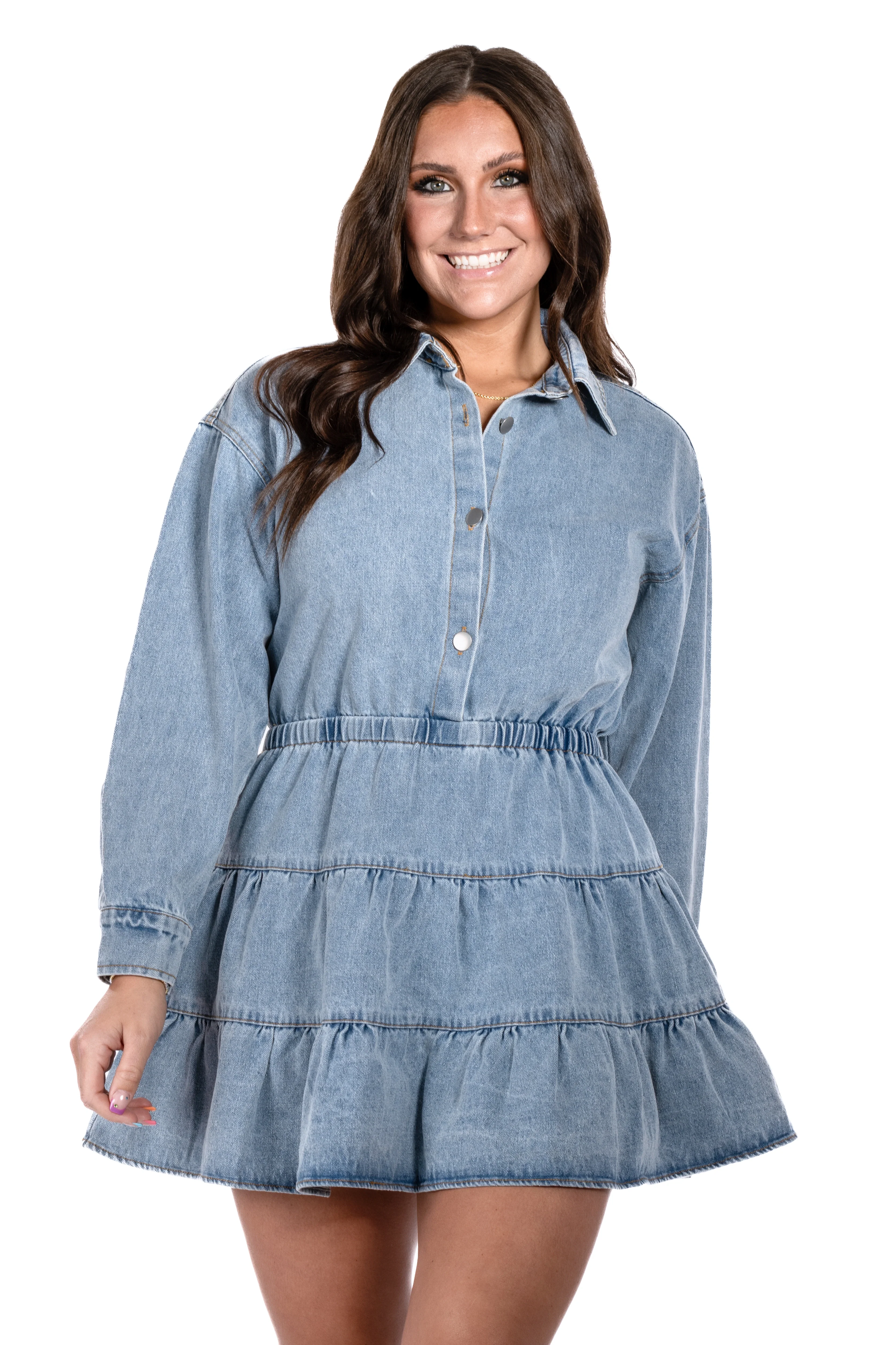 This denim dress is an instant classic! Featuring a collared neckline, elastic waistband, and button cuffs, this tiered dress is both stylish and comfortable. Perfect for any occasion, from casual outings or dress it up, this dress will elevate your wardrobe and showcase your unique sense of style.